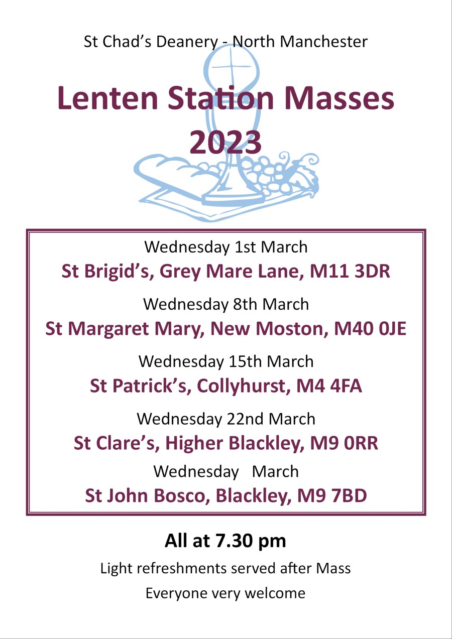 LENTEN STATION MASSES. On four Wednesdays of Lent there will once again be Station Masses in various churches of our deanery – North Manchester. The first of those Masses will be on Wednesday 12th of March at 7.30 pm at St. Chad’s Cheetham Hill. There will be opportunity for confession with priests of the deaneryContinue…